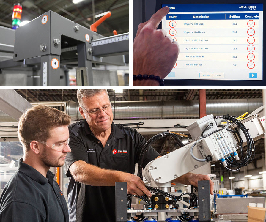 Operators and maintenance technicians may need to support multiple machines in a line. Depending on staffing needs, they may also have to help out on different lines or machines. When that happens, having a common interface on all or most of these machines is extremely helpful. Pearson offers a comprehensive line of case erectors, bliss formers, packers, sealers, palletizers, bag and partition inserters that all have a uniform user interface that allows operators to easily transition from one piece of equipment to another.